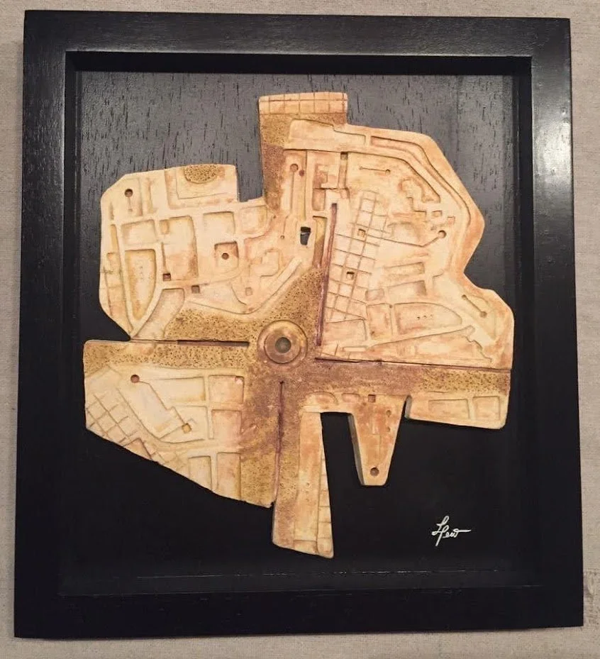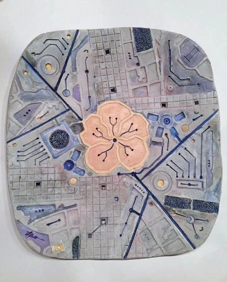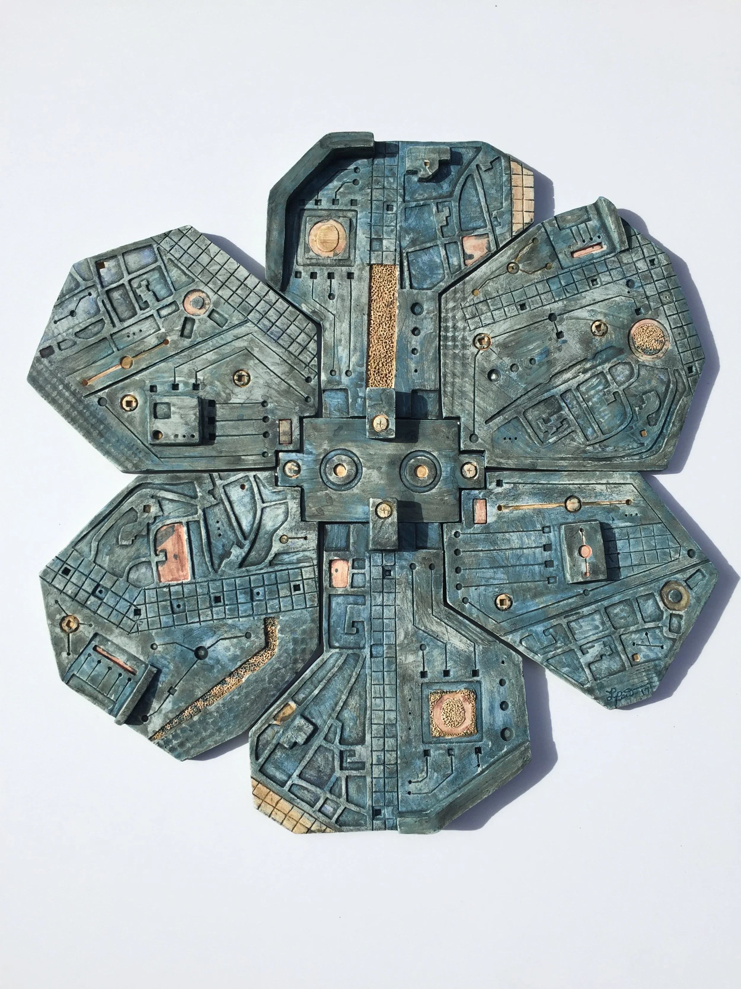 "Vías en Brote" ("Traces in Bloom") Ceramic, and oxides over 3/4" PVC backing. (2018). 12 3/8" x 12 1/2" x 5/8". Private Collection.