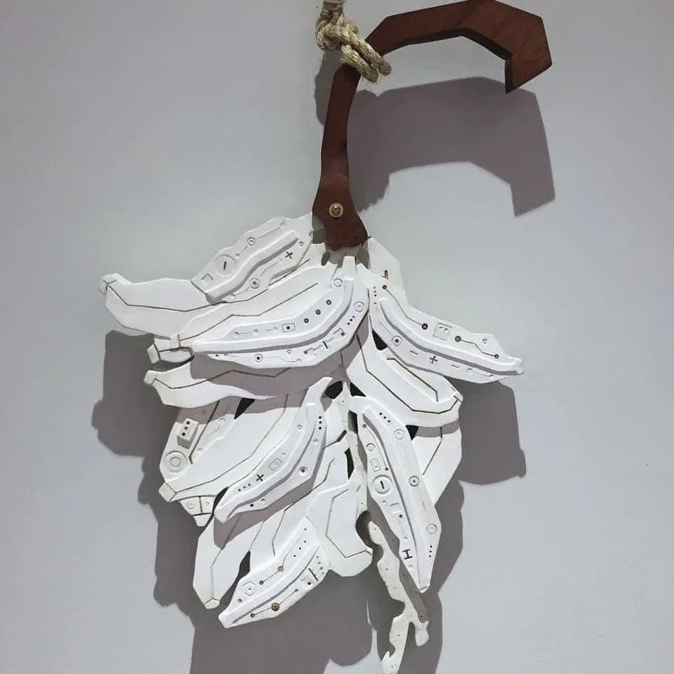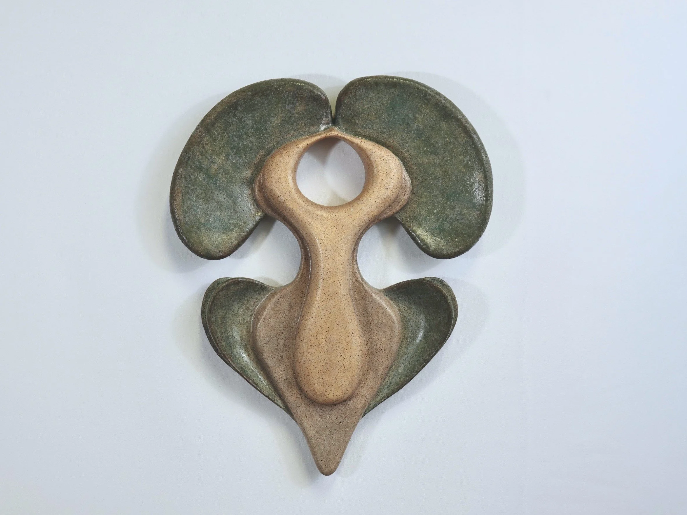 "¿Plátanos? I" ("Plantains? I") Ceramic, copper oxide and reclaimed mahogany wood. (2018). 18" x 27" x 5". Private Collection.