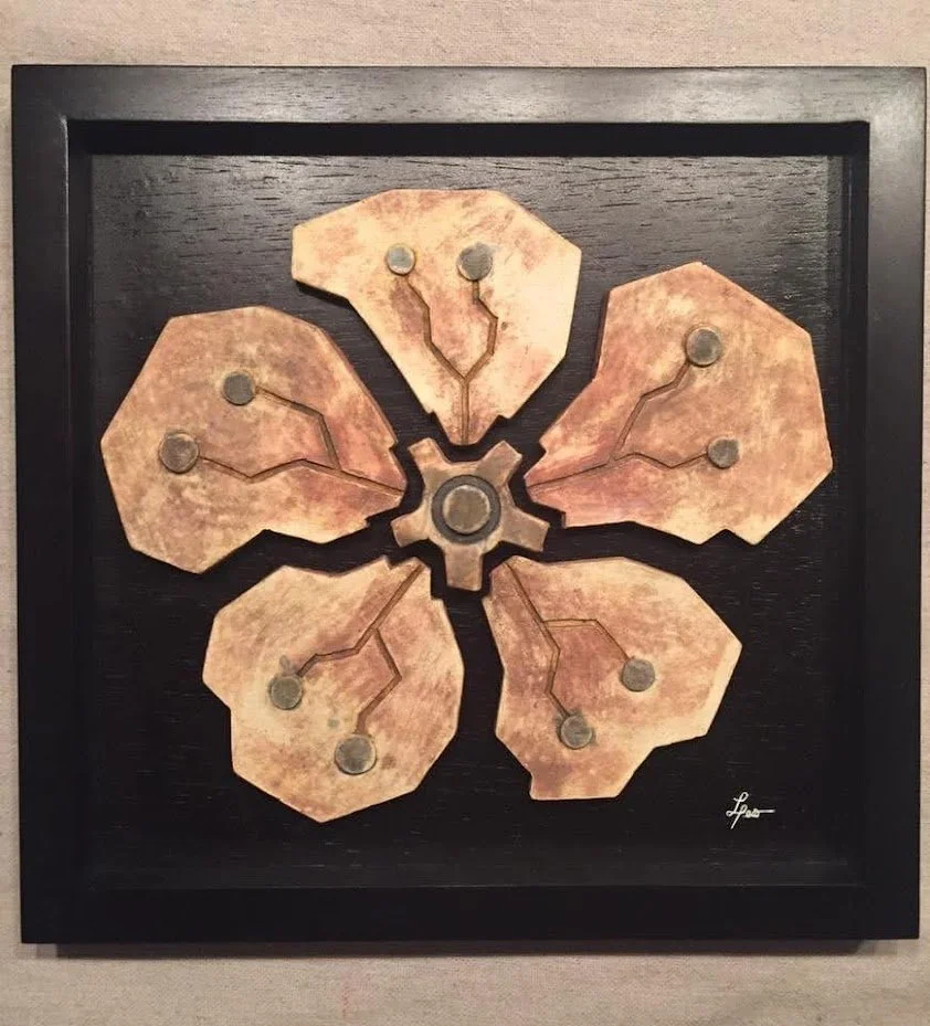 "Flor III" ("Flower III") Ceramic, oxides and wood frame. (2017). 11" dia. Private Collection.