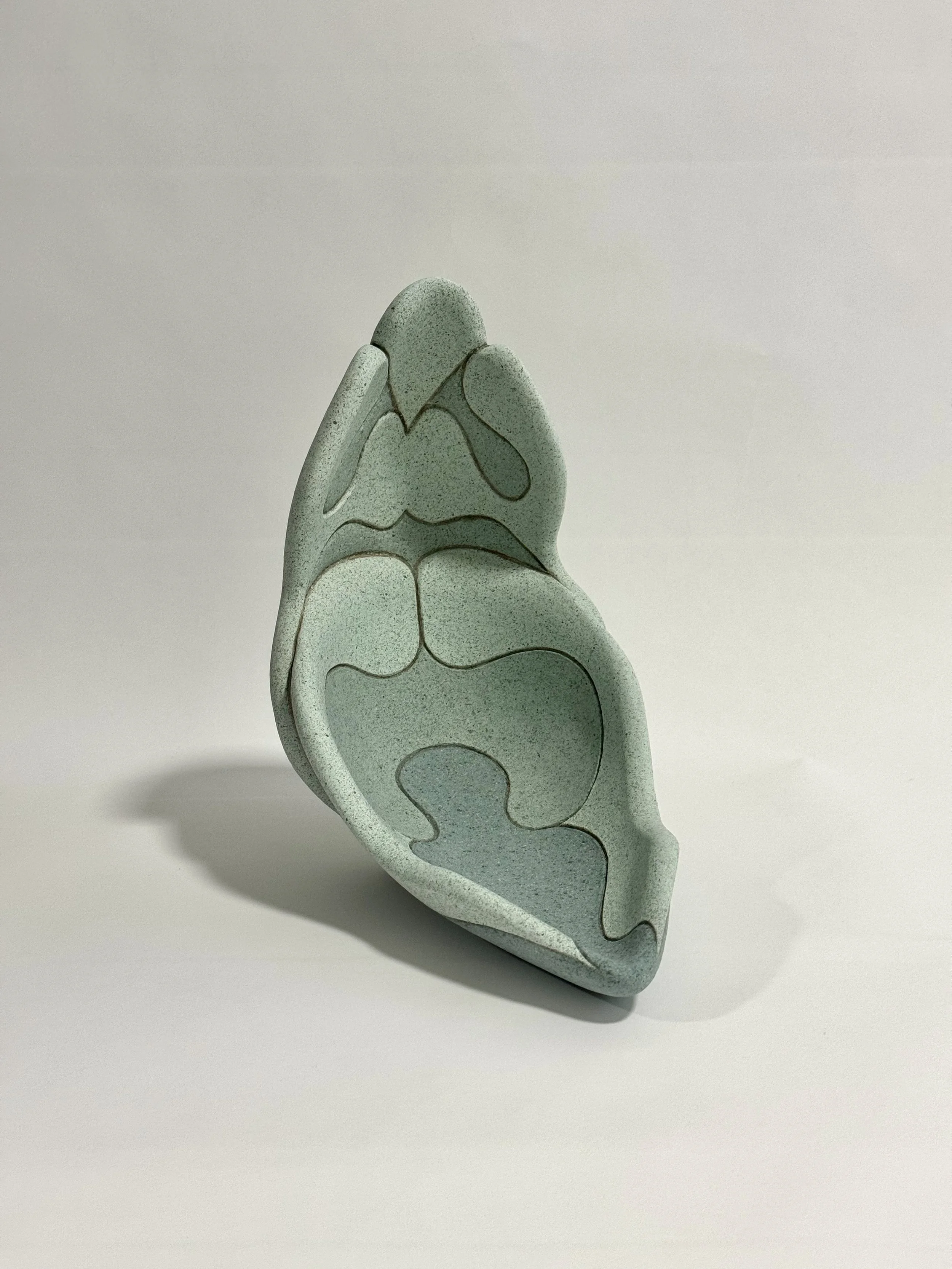 "Reminiscencia" ("Reminiscence"). Ceramic, underglaze and glaze. (2024). 4.25" x 9.25" x 5.75"